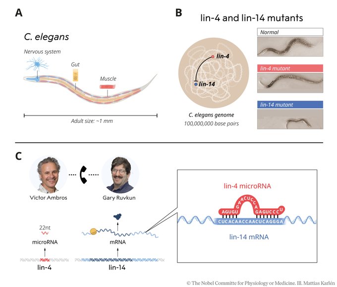 Los galardonados en Medicina de este año, Victor Ambros y Gary Ruvkun, estudiaron un gusano redondo relativamente modesto de 1 mm de largo, el C. elegans. A pesar de su pequeño tamaño, el C. elegans posee muchos tipos de células especializadas, como células nerviosas y musculares que también se encuentran en animales más grandes y complejos, lo que lo convierte en un modelo útil para investigar cómo se desarrollan y maduran los tejidos en organismos multicelulares. Cómo las investigaciones de los galardonados en Medicina de 2024 sobre el C. elegans revelaron una dimensión completamente nueva de la regulación genética.