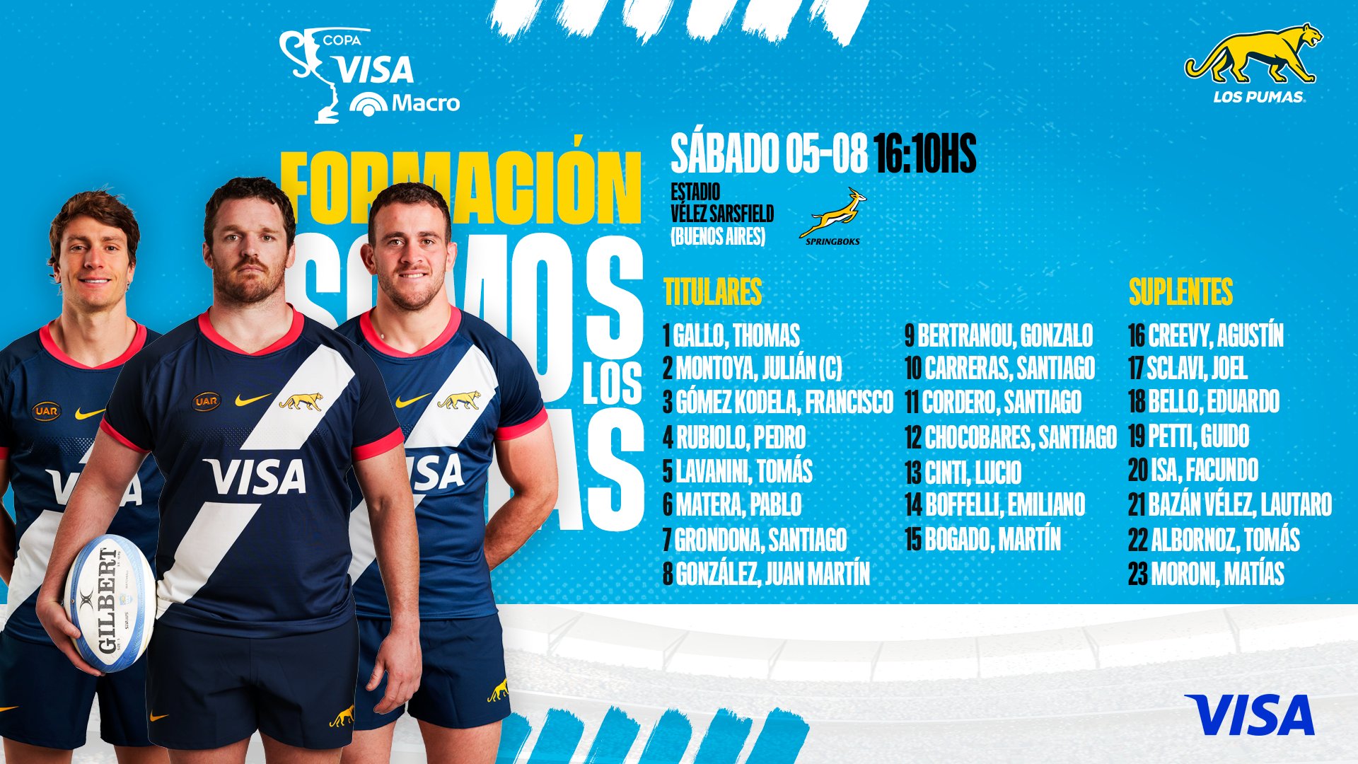 LOS PUMAS (25): 1. Thomas Gallo, 2. Julián Montoya (C), 3. Joel Sclavi; 4. Matías Alemanno 5. Tomás Lavanini; 6. Juan Martín González, 7. Marcos Kremer, 8. Pablo Matera; 9. Gonzalo Bertranou, 10. Santiago Carreras; 11. Lucio Cinti, 12. Matías Orlando, 13. Matías Moroni, 14. Emiliano Boffelli; 15. Juan Cruz Mallía.