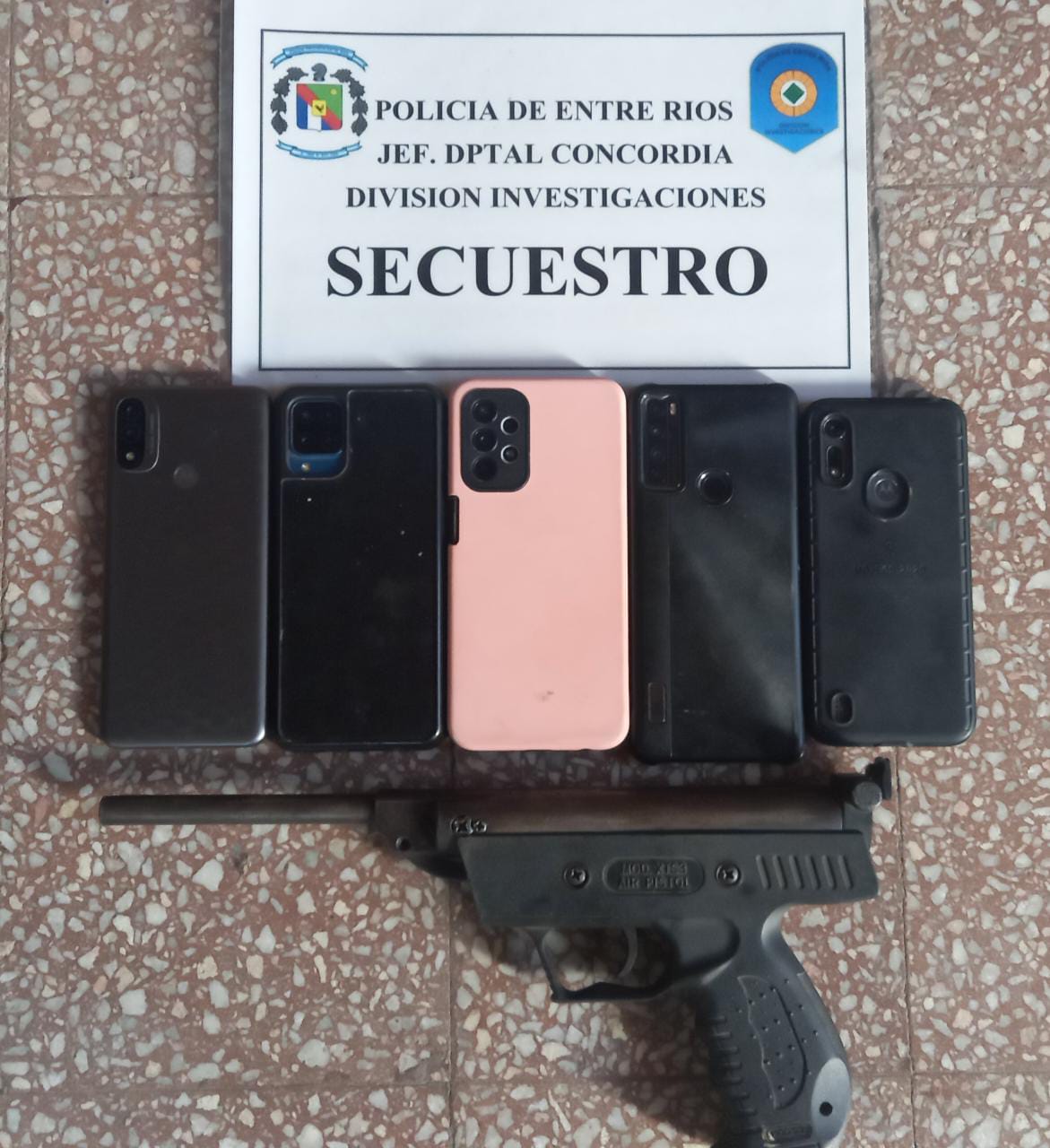 Personal de la División Investigaciones de la Jefatura Departamental realizó seis allanamientos en conjunto con personal de la División Operaciones y Seguridad, División Toxicología, Cuerpo y Guardia, y Guardia Especial, en relación a una causa por Abuso de Armas. En los procedimientos, que tuvieron lugar en el Asentamiento Las Tablitas, secuestraron un arma de fuego tipo pistola cal .22 (foto), cartuchería de diversos calibres, un aire comprimido, una culata de aire comprimido (desarmado sin el mecanismo), teléfonos celulares (foto), y prendas de vestir de interés para la causa, fue advertido este medio.