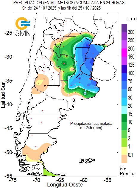 Los valores de precipitaciones medidos por el SMN en las últimas 24 horas.