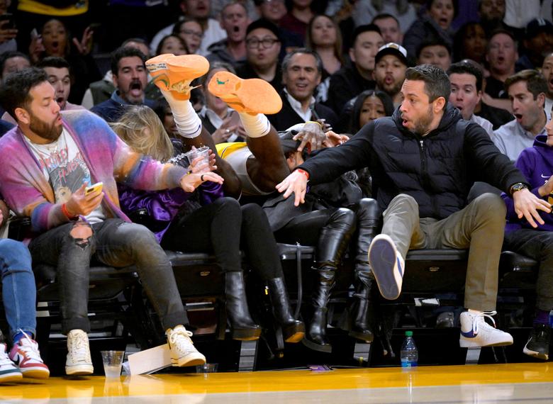 El alero de Los Angeles Lakers, LeBron James, aterriza sobre los fanáticos sentados al costado de la cancha mientras se lanza tras una pelota en la segunda mitad de su juego contra Los Angeles Clippers. Jayne Kamin-Oncea-USA TODAY Sports
