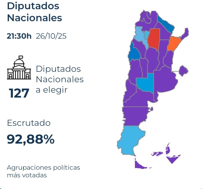 Entre Ríos: 3 bancas de diputados nacionales para la ALLA, 2 bancas para Fuerza Entre Ríos, escrutado el 95,04%. Senadores: 2 bancas para la ALLA, 1 para Fuerza Entre Ríos. Escrutado el 95,04.%