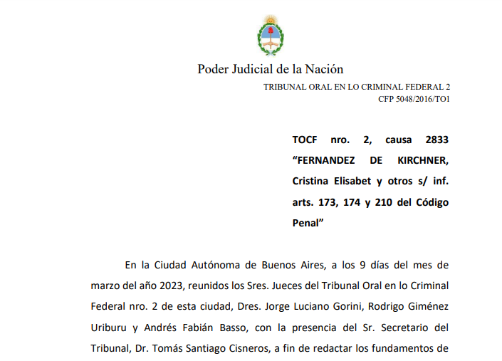 Siguiendo con el derrotero judicial, hoy se dieron a conocer los fundamentos de la sentencia de la causa número de Expediente 2833, que se tramitó en el Tribunal Oral en lo Criminal Federal N°2 de CABA, conocida como Obra Pública en Santa Cruz/Vialidad.