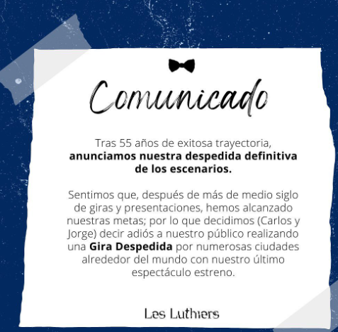 La decisión fue tomada por sus dos integrantes "históricos", que forman parte del grupo desde su creación en 1967: Carlos López Puccio y Jorge Maronna, con sentidas palabras. Harán una gira por el país con su último show, además de recorrer salas de México, Colombia, Costa Rica, Chile, Uruguay y España, indicaron.