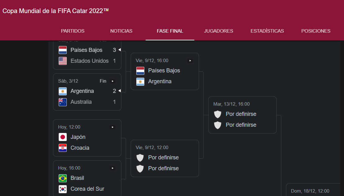 Por la llave de Argentina, juegan Japón con Croacia, y Brasil vs Corea del Sur, en octavos de Qatar 2022. Los ganadores de ambos encuentros se cruzan en cuartos. Y de allí saldrá el rival de Argentina - Países Bajos en semis.