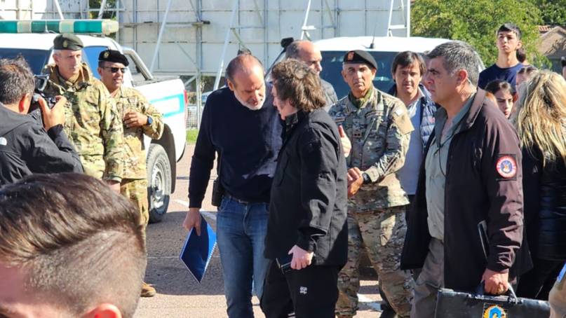 Alrededor de las 10.15, Milei arribó al hospital de campaña instalado en el Bahía Blanca Plaza Shopping. Quince minutos más tarde salió y La Nueva., que se encuentra junto a la comitiva, observó un sentido abrazo entre el presidente y Susbielles.