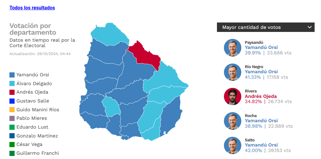 Como ninguna fórmula presidencial obtuvo los votos necesarios para proclamarse ganadora en primera vuelta, que son un 50%, más uno de los sufragios, se pasará a definir en una segunda vuelta (o balotaje) entre las dos candidaturas con más votos: Yamandú Orsi (Frente Amplio) y Álvaro Delgado (Partido Nacional).
