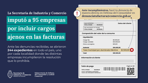 La Secretaría de Industria y Comercio del Ministerio de Economía imputó a 95 empresas por haber incluido en las facturas tasas o cargos ajenos al contrato entre el proveedor y el consumidor. Se abrieron 244 expedientes vinculados a las imputaciones, uno por cada localidad donde las empresas incumplieron la norma.